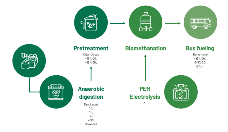 The upgrading technology consists in reacting the remaining CO2 with H2 to enrich the methane content to >95%. This reaction occurs inside a reactor with specialised microorganisms that consume the substrate and give CH4 as a product. The H2 needed comes from a novel proton exchange membrane water electrolysis (PEMEL) designed by PROPULS with collaboration from SINTEF. Before biomethane can be used as fuel for public transportation, it must undergo a scrubbing process to remove impurities such as H2S, volatile organic compounds (VOCs), and siloxanes in order to protect the equipment. Once the biomethane has been scrubbed and purified, it undergoes compression to create compressed natural gas (CNG), which is then ready to be used as fuel for public transportation vehicles. This ensures that the biomethane meets the required standards and is safe and efficient for use in the transportation sector.